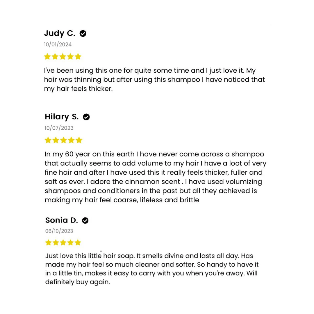 Got hair that's falling out in tufts? Or noticing thinning along your hairline? Our Cinnamon Shampoo Bar is everything you need for stimulating hair follicles at the root and promoting new hair growth, the natural way. The go-to bar when your hair needs a bit of lift and volume or new growth. Containing nettle extract, rosemary oil, cinnamon oil, and clove oil, these powerful ingredients help stimulate your hair and scalp, giving a warming sensation, and bringing your hair follicles to life. These ingredients are also known to promote new hair growth. Suitable for normal to dry hair. This shampoo is colour-safe to use on highlights. Got dark dyed hair? Try our colour-protective Rice Water Protein Shampoo Bar instead.